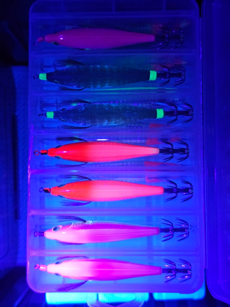 두족류 에기 종류별 자외선 변색및 야광축광반응 야마시타AJ 야마시타네추럴 야마시타레이저 자외선 uv라...