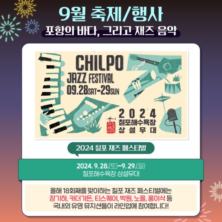 포항을 대표하는 음악축제! 칠포 재즈 페스티벌 2024 칠포 재즈 페스티벌 올해 18회째를 맞이하는 칠포 재...