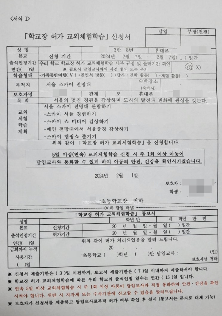 서울 롯데타워 스카이 전망대 교외체험학습 신청서 결과 보고서 작성방법 예시