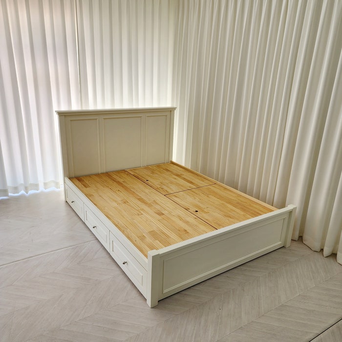 수납침대 퀸 사이즈 원목으로 주문 제작되었습니다. 앞쪽은 서랍 안쪽에는 벙커 수납형 아쉬운 하부 공간을...