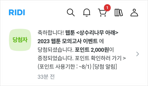 리디북스에서 웹툰 《상수리나무 아래》 모의고사 이벤트를 참여했는데 당첨됐네요 얼마나 많은 사람들을 ...