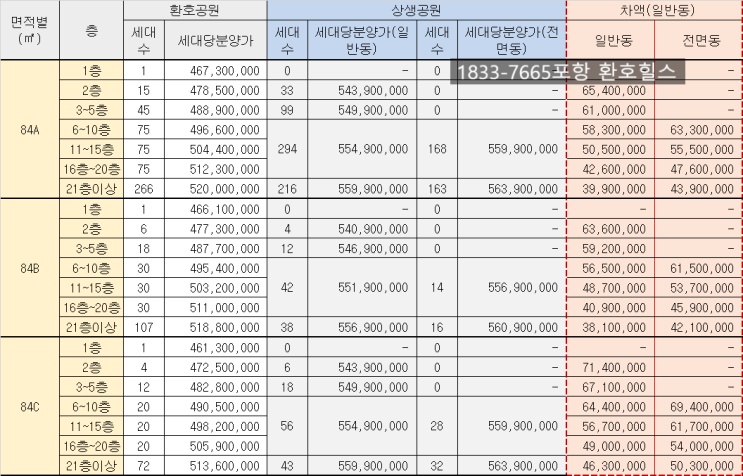 포항 상생 더샵 힐스테이트 분양가 나왔습니다 ~ 기준층 기준 84 타입 5.5억 127 타입 8억 발코니확장비 무...