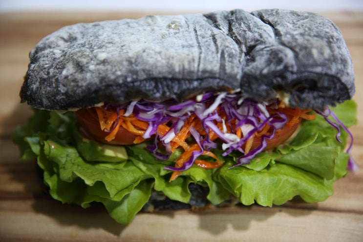 유기농 먹물 치아바타 샌드위치/비건빵 통밀 치아바타 샌드위치/홈메이드 땅콩버터/캐슈마요 소스/현미조청 블루베리잼