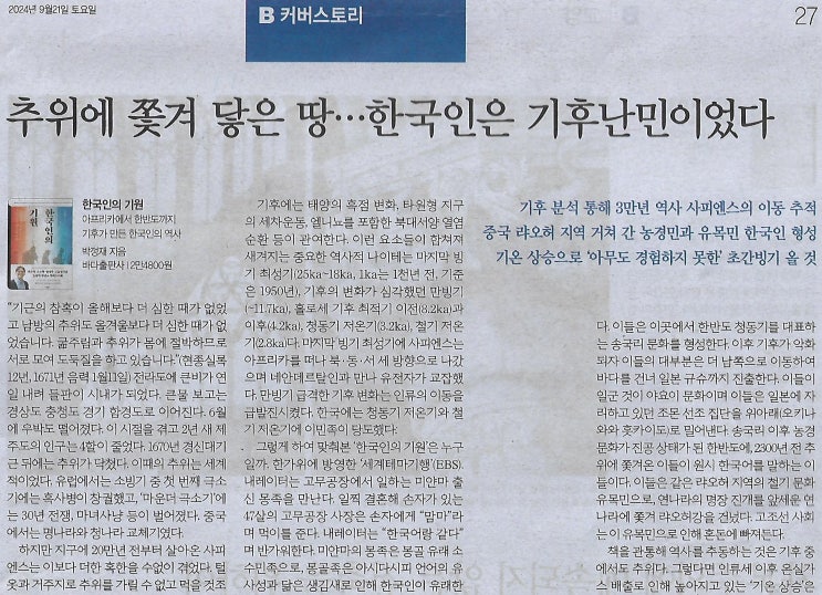 B/ 커버스토리/ 한국인의 기원/ 박정재 지음ㅣ바다출판사/ 추위에 쫓겨 닿은 땅…한국인은 기후난민이었다(민중이 깨어나야 나라가 바로 선다)