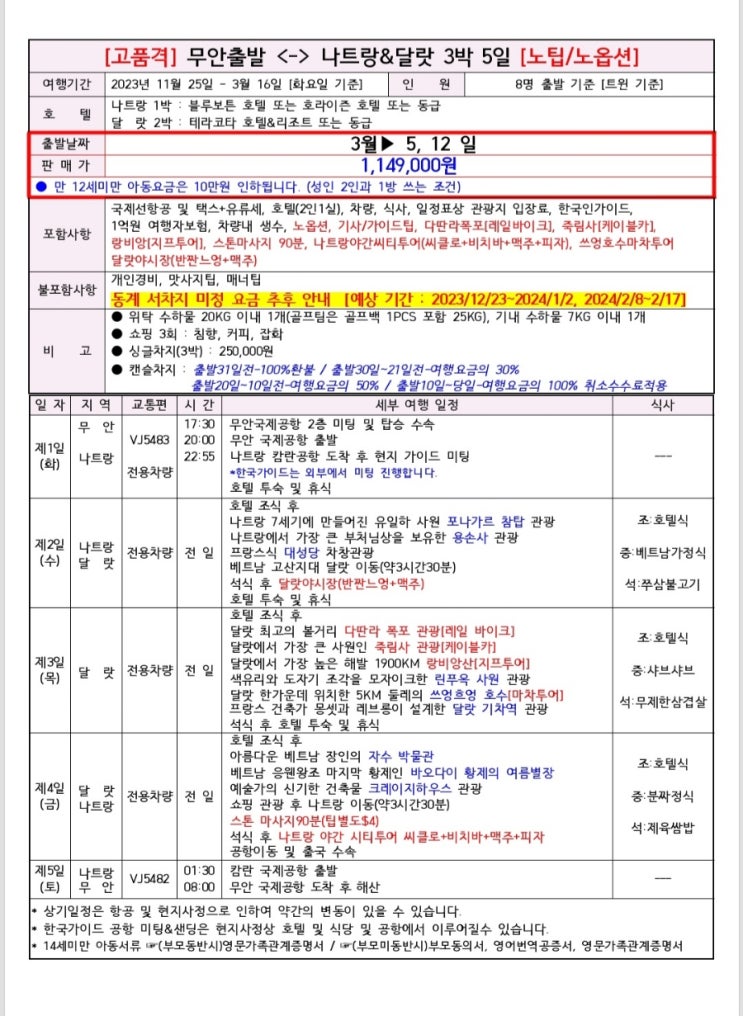 #고품격 무안출발 <-> 나트랑&달랏 3박 4일 [노팁/노옵션] #여행기간:2023년 11월 25일 - 3월 16...