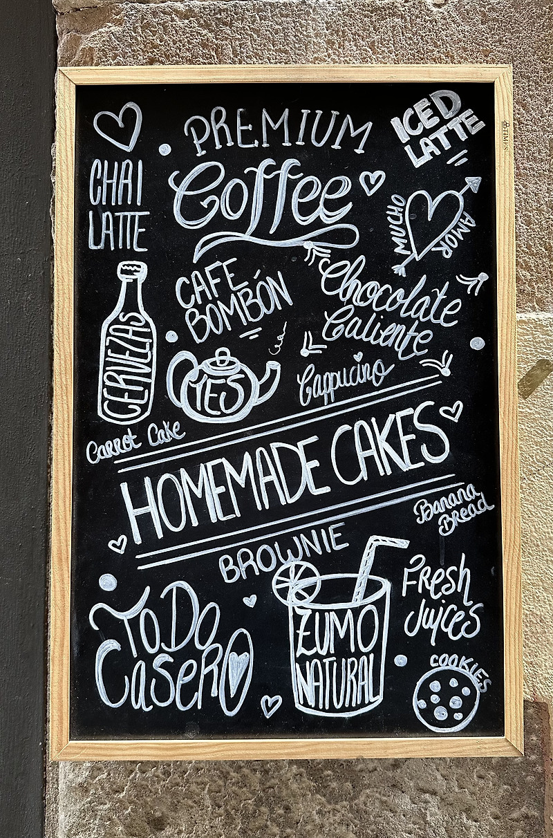 영어나 스페인어나 같은 알파벳을 사용하기에 바르셀로나에서도 손글씨로 만든 이름다운 입간판들을 여럿 볼 수 있었다. 어느 도시를 가든 주인의 개성과 가게의 특성을 드러내는 이런 손글씨