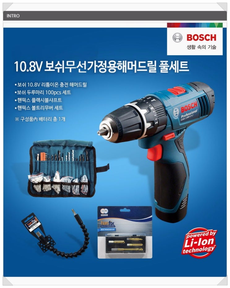 10.8V 보쉬 무선 가정용 해머드릴 풀세트, 플렉시블샤프트, 볼트 리무버 세트(Bosch GSB 1080 2 LI Professional)