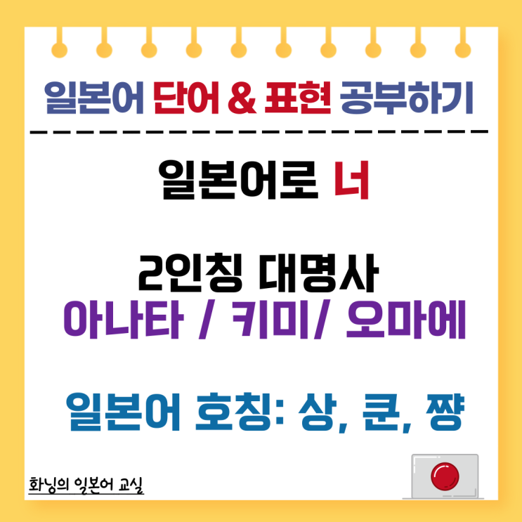 안녕하세요! 화닝입니다. 저번 시간에는 '너'에 해당하는 일본어 2인칭에 대해 알아보았습니다. ...