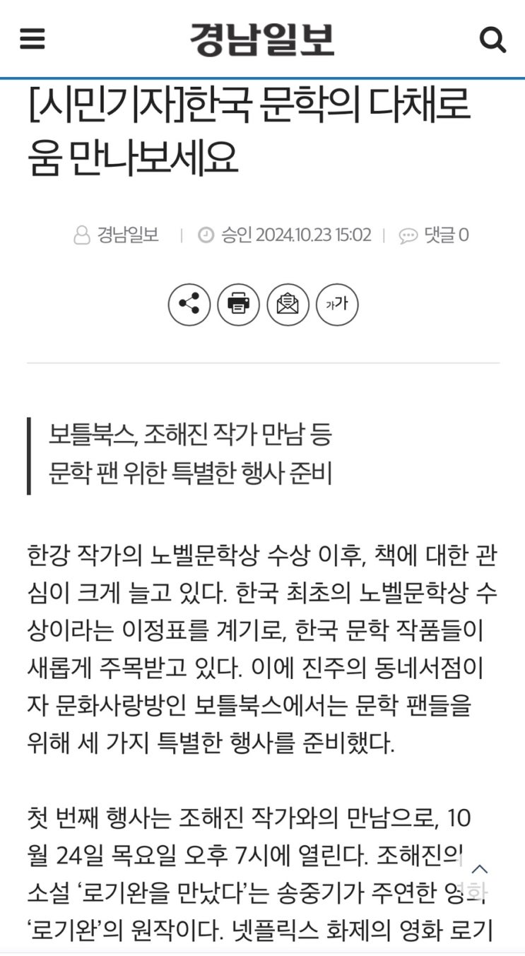 드디어 오늘 조해진 작가님과의 만남, 경남일보에 보틀북스 행사 소식!