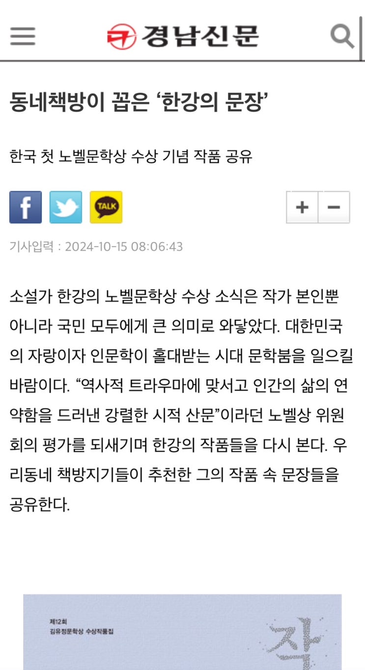 경남신문에 동네책방이 꼽은 한강의 문장들이 소개되었어요!