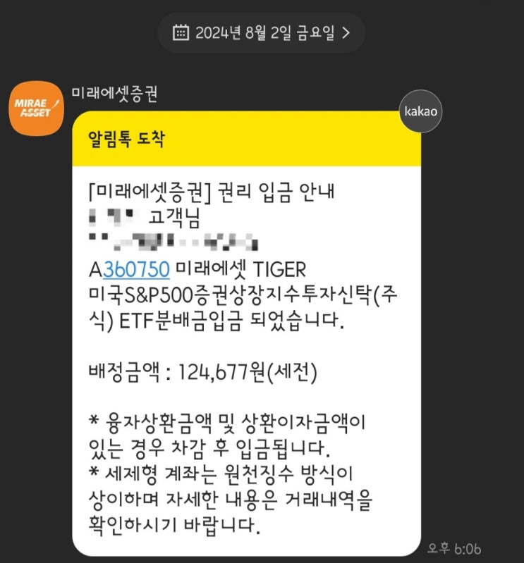 TIGER 미국S&P500 배당금 입금 (2024.08.02)