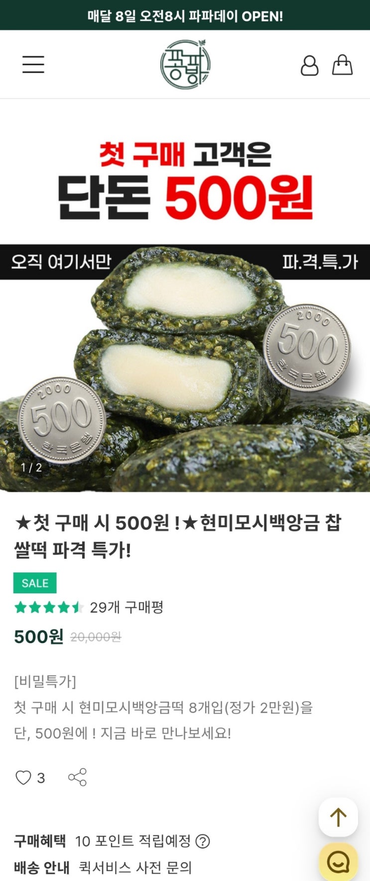 [파파공방] 신규 첫구매 현미모시백앙금 찹쌀떡 4500원 비싼떡인가봐요 가입시 500원 + 배송비 이벤트는 변...