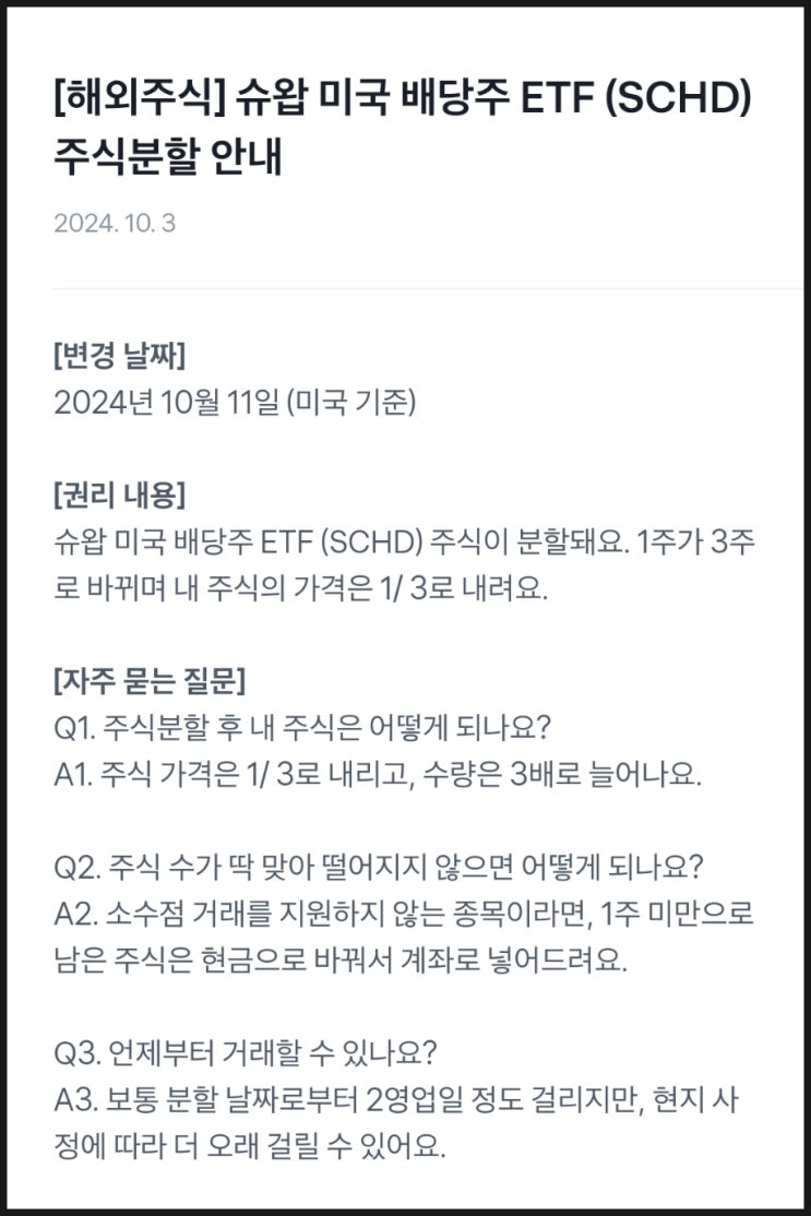 월배당ETF SCHD 주식분할 매수 장점! 소수점투자 주식수는? 국내상장 ETF 수수료!