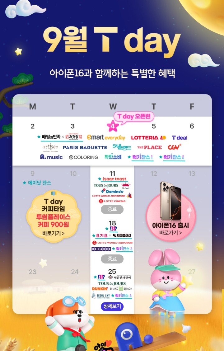 9월 25일 SKT Tday 9월의 마지막 티 데이네요. 베스킨라빈스, 명륜진사갈비 5천원 할인, 뚜레쥬르 30% ...