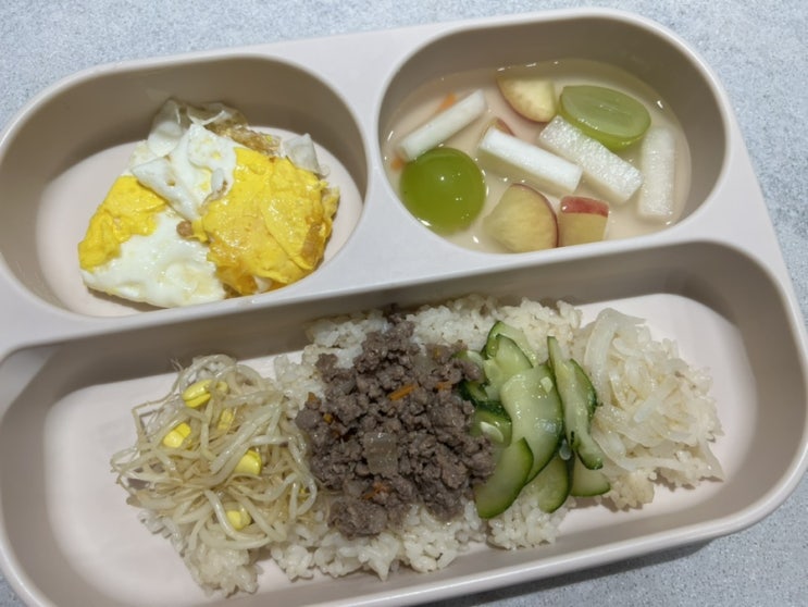 이날 가든이의 저녁 메뉴는 비빔밥과 과일동치미 밥위에 소고기 삼색나물을 올린 건강한 어린이 비빔밥과 ...