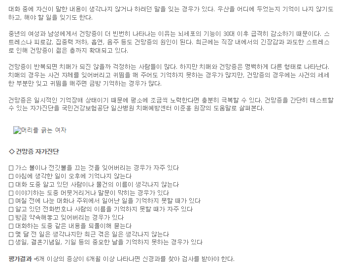 치매는 누구에게나 두려운 질환이며 나이가 들수록 발병 가능성이 증가하기에 미리 예방관리를 하는 것이 ...