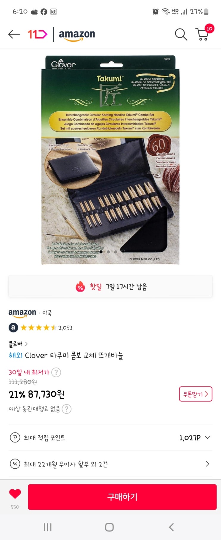 타쿠미 콤보 대바늘 구입 11번가 아마존 핫딜 85000원