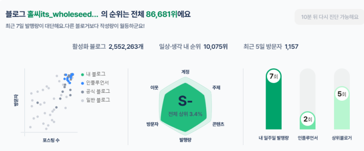 안녕하세요 홀씨입니다. 최근에 판다 랭크에서 블로그 분석을 했는데 전체 상위 3.4% S- 등급이 나왔어요 ...