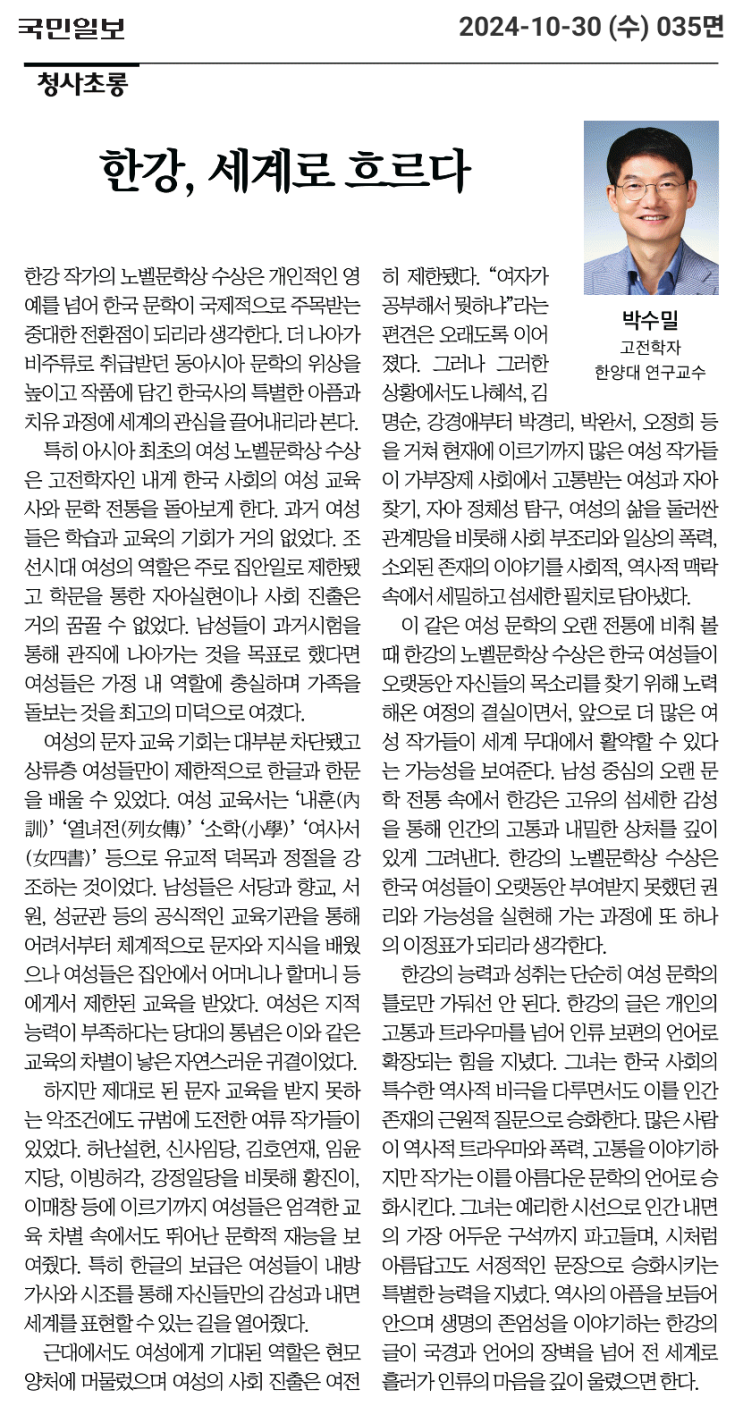 [국민 241030] 한강, 세계로 흐르다