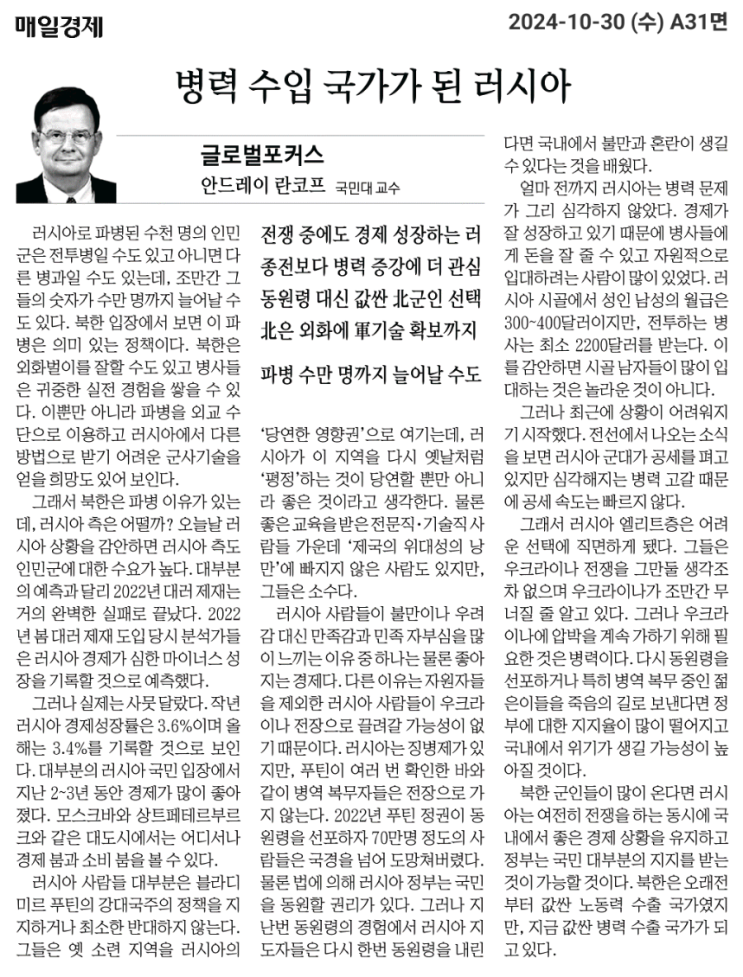 [기사제목] : 병력 수입 국가가 된 러시아 병력 수입 국가가 된 러시아 글로벌포커스 안드레이 란코프 국민...