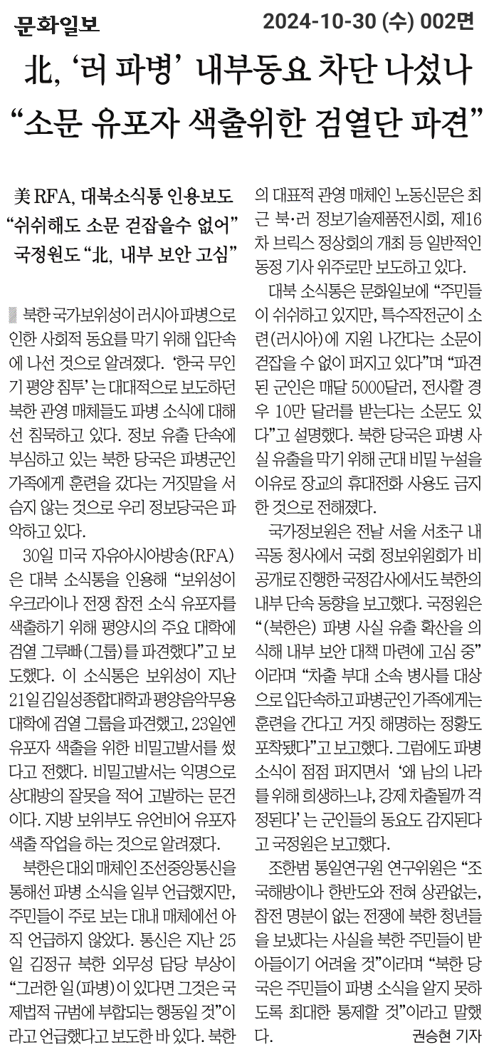 [기사제목] : 北, '러 파병' 내부동요 차단 나섰나 "소문 유포자 색출위한 검열단 파견&quo...