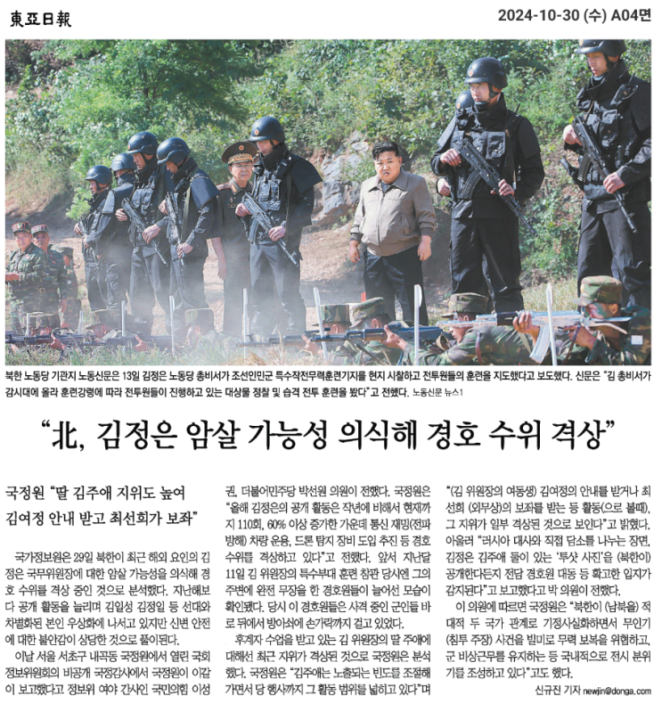 [동아 241030] “北, 김정은 암살 가능성 의식해 경호 수위 격상”
