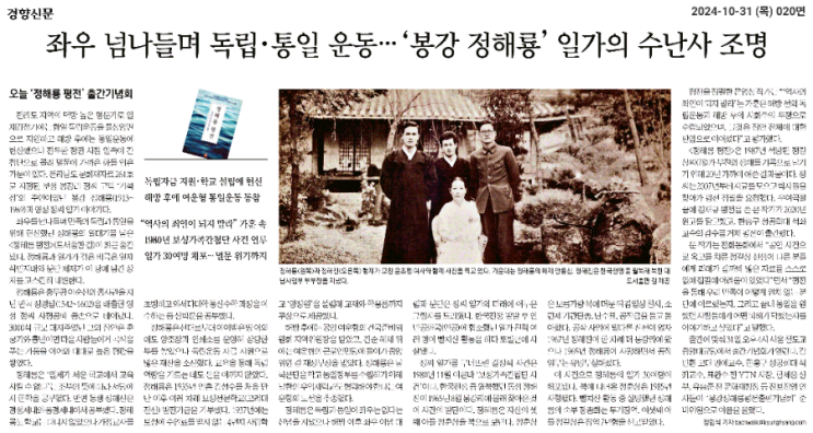 [경향 241031] 좌우 넘나들며 독립 통일 운동… '봉강 정해룡' 일가의 수난사 조명