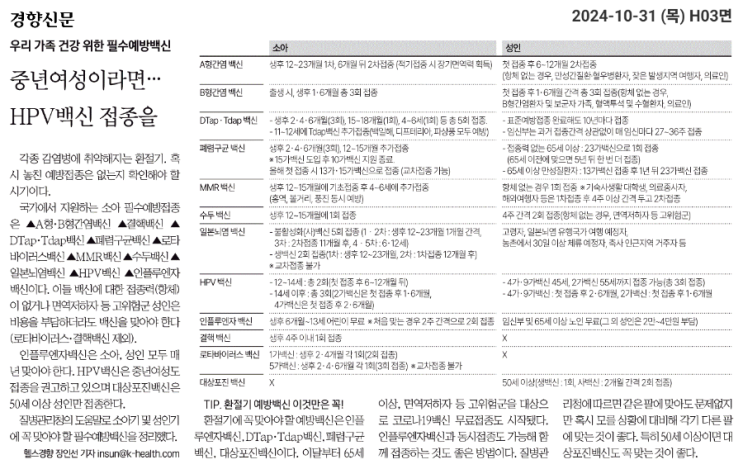 [경향 241031] 중년여성이라면… HPV백신 접종을