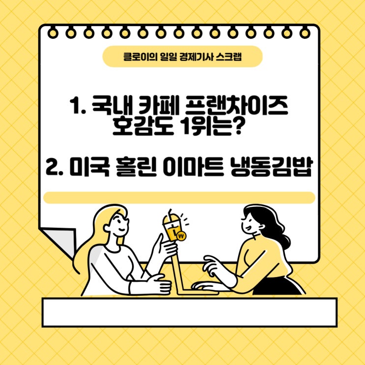 [경제기사 스크랩] 1/19 국내 커피 전문 프랜차이즈 호감도 1위는?/ 미국 홀린 이마트 냉동김밥!