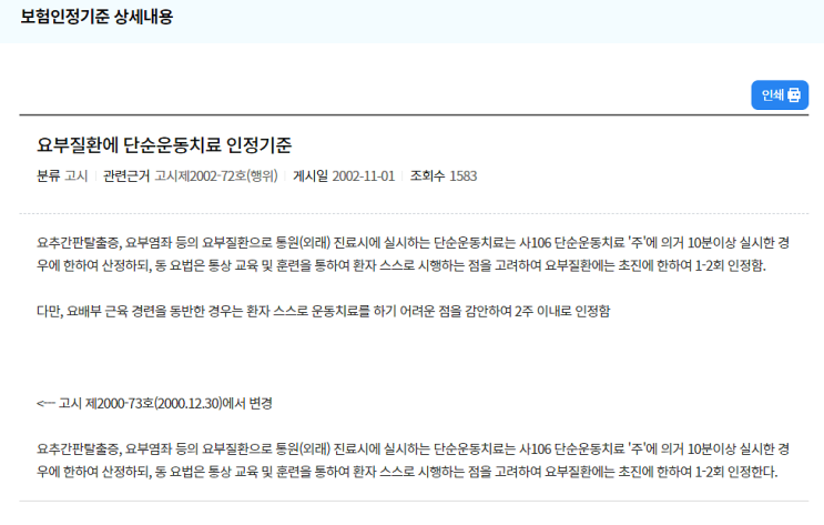 [청구] 고시. 요부질환에 단순운동치료 인정기준