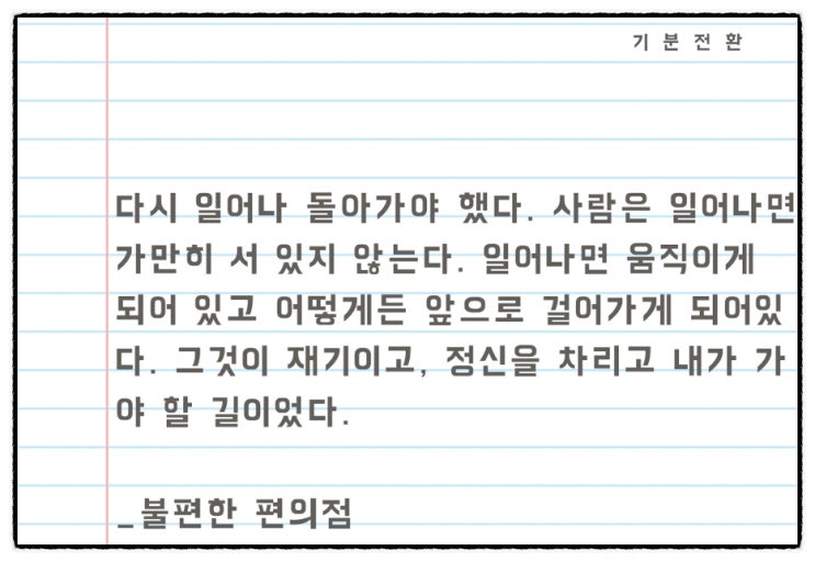 움직여야만 한다. 가만히 있으면 아무도 구해주지 않는다. 나를 구할 수 있는 것은 나 자신뿐 어느 누구의 ...