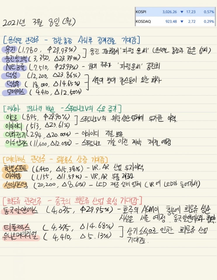 2021.03.08(월) 시장정리 - 윤석열 / 스푸트니크 / 메타버스