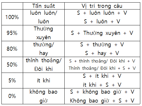 1. 빈도 부사 ① hay, luôn, luôn luôn : 주어 뒤에 사용 ② thường, thường thường, thỉnh thoảng...