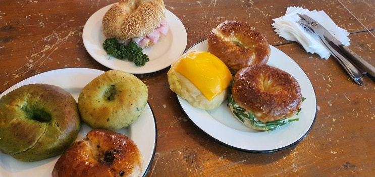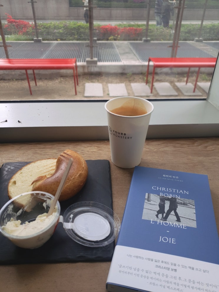 22.4.29.금 나는 카페의 창가 자리 구석에 앉아 따뜻한 라떼와 베이글, 그리고 무화과 크림치즈를 먹고 있...