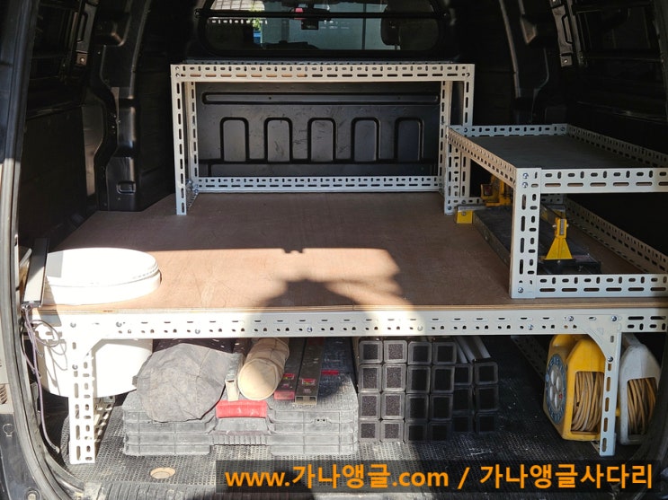 스타렉스 5밴의 조립식앵글 작업사진 입니다. 평상스타일로 아랫단을 설치하고 상단에 공구 및 자재를 적재...