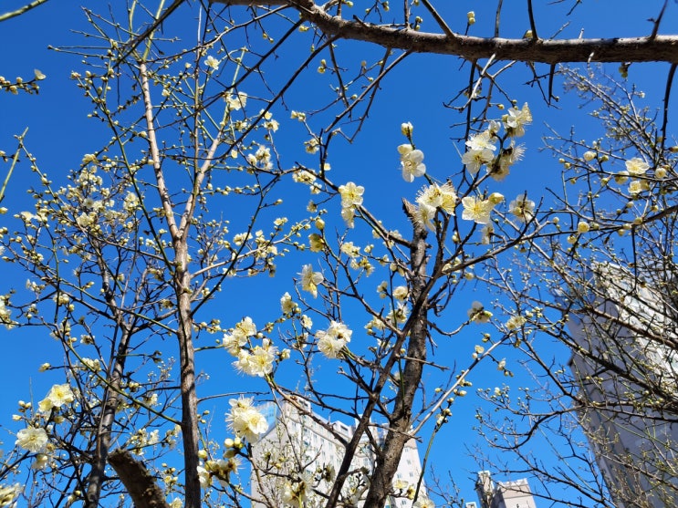 오늘 오후 둘째 아이와 자전거를 타고 집으로 돌아오는 길에 이제 막 피어오르기 시작한 매화꽃들을 만났습...