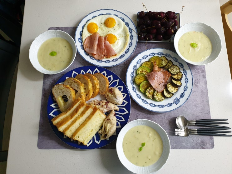 어느 여름날 일요일 내 스타일의 브런치 우리쌀 크림수프 위에 내가 키운 바질 한톨씩 바질을 더 올리고 싶...