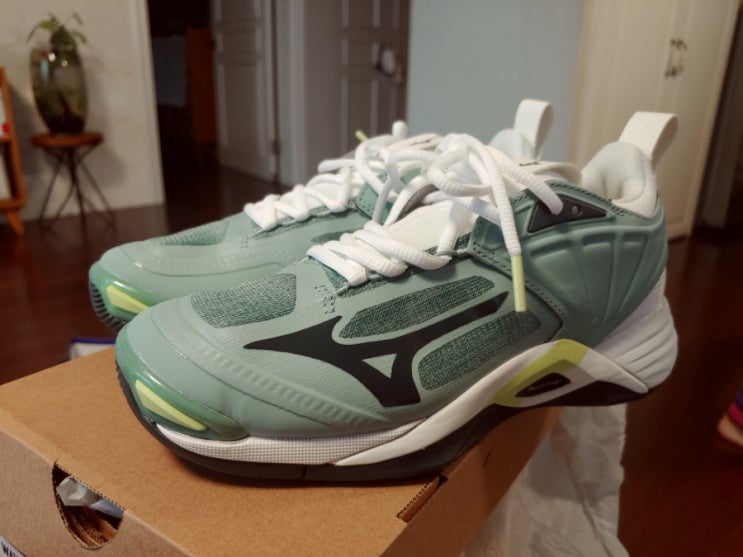 미즈노 모멘텀2. 민턴화로 구매배구화로 나온 모델입니다.큐션에 중점을 둔 모델인것 같아요. 큐션이 매...