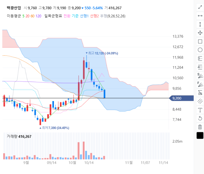10월 초 백광 비중을 좀 줄였습니다. 단기간 많이 올라서 ... 그리고 그때 차트에 지지선 그었죠 오늘 지지...