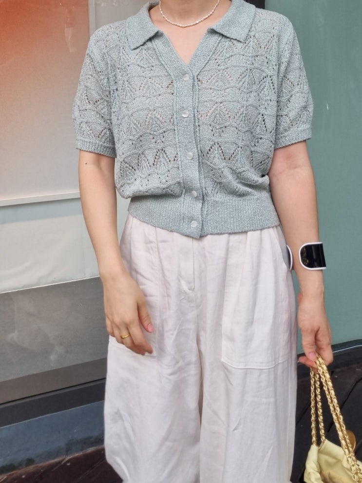 깔끔 단정하게 입기 좋은 카라 반팔가디건 색깔이 다양하지 않아서 좀 아쉽긴 한데 저처럼 여름에 면티는 ...