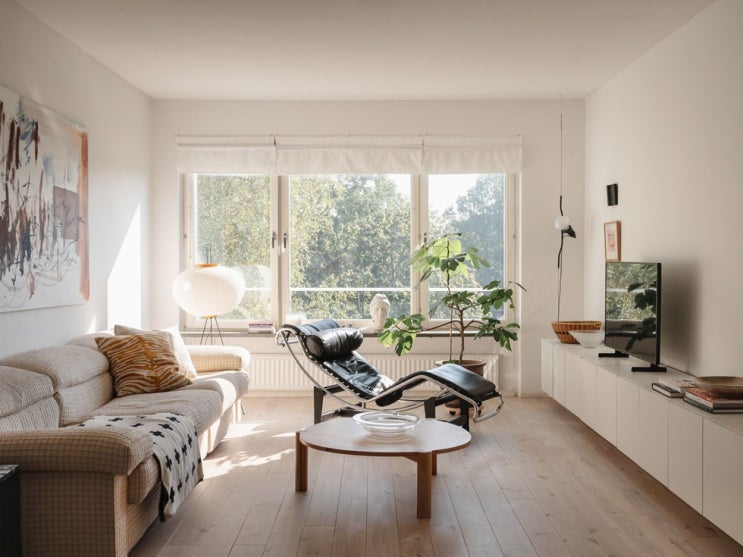 집 전체 화이트베이스로 담아냈고 넓은 면적으로 빈 벽면에는 액자 한 두점으로 포인트만 준 미니멀라이프 ...