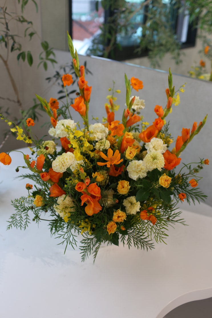 (청담동 꽃집) 가을 코스모스 담은 옐로우-오렌지 센터피스 / 꽃바구니
