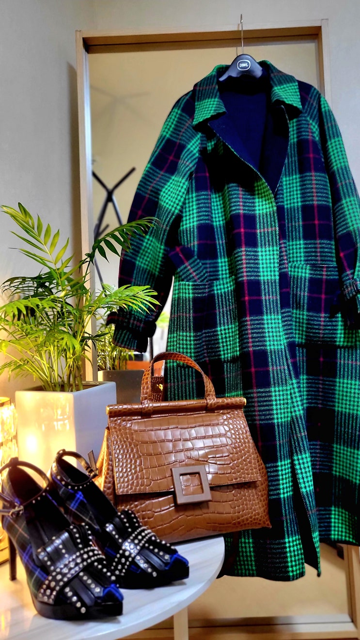 크리스마스 분위기를 살려 본 착장아이템 럭키슈에뜨 체크코트 36 세컨플로어 니트원피스 66 슈콤마보니 체...