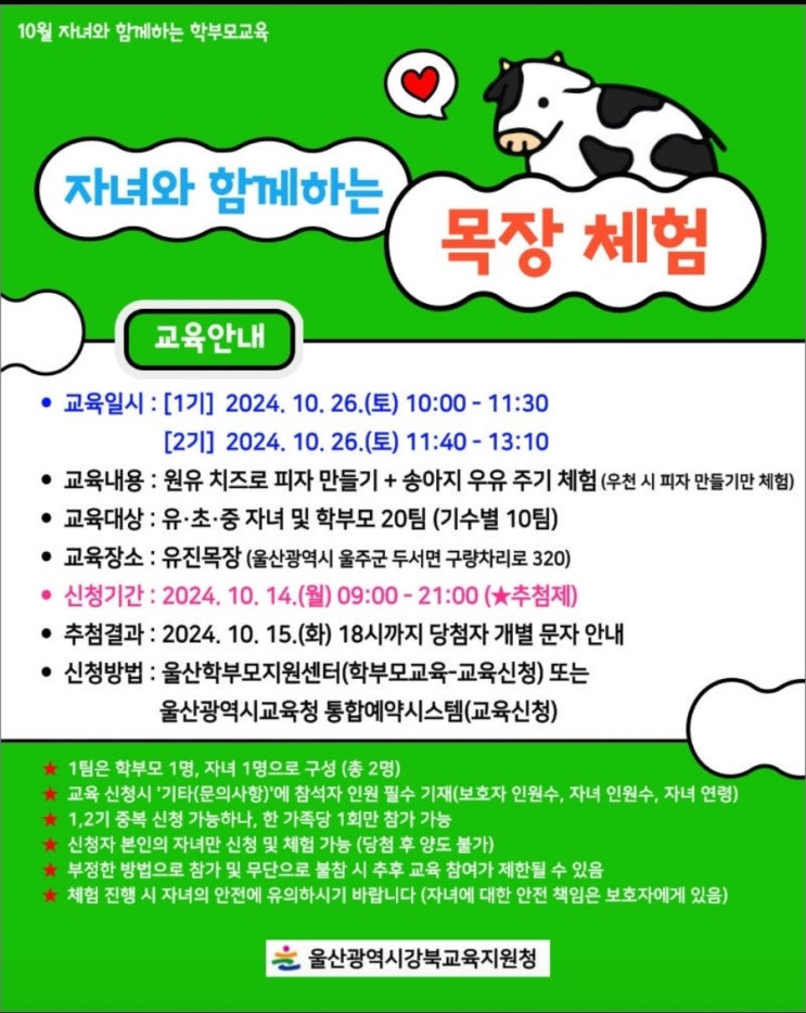 울산 10월 학부모교육 자녀와 함께 하는 목장 체험 신청 ?? 울산 강북교육지원청 10월 학부모교육 신...