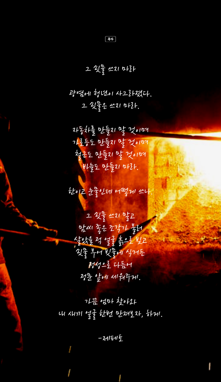 그 쇳물 쓰지 마라 광염에 청년이 사그라졌다. 그 쇳물은 쓰지 마라. 자동차를 만들지 말 것이며 가로등도 ...