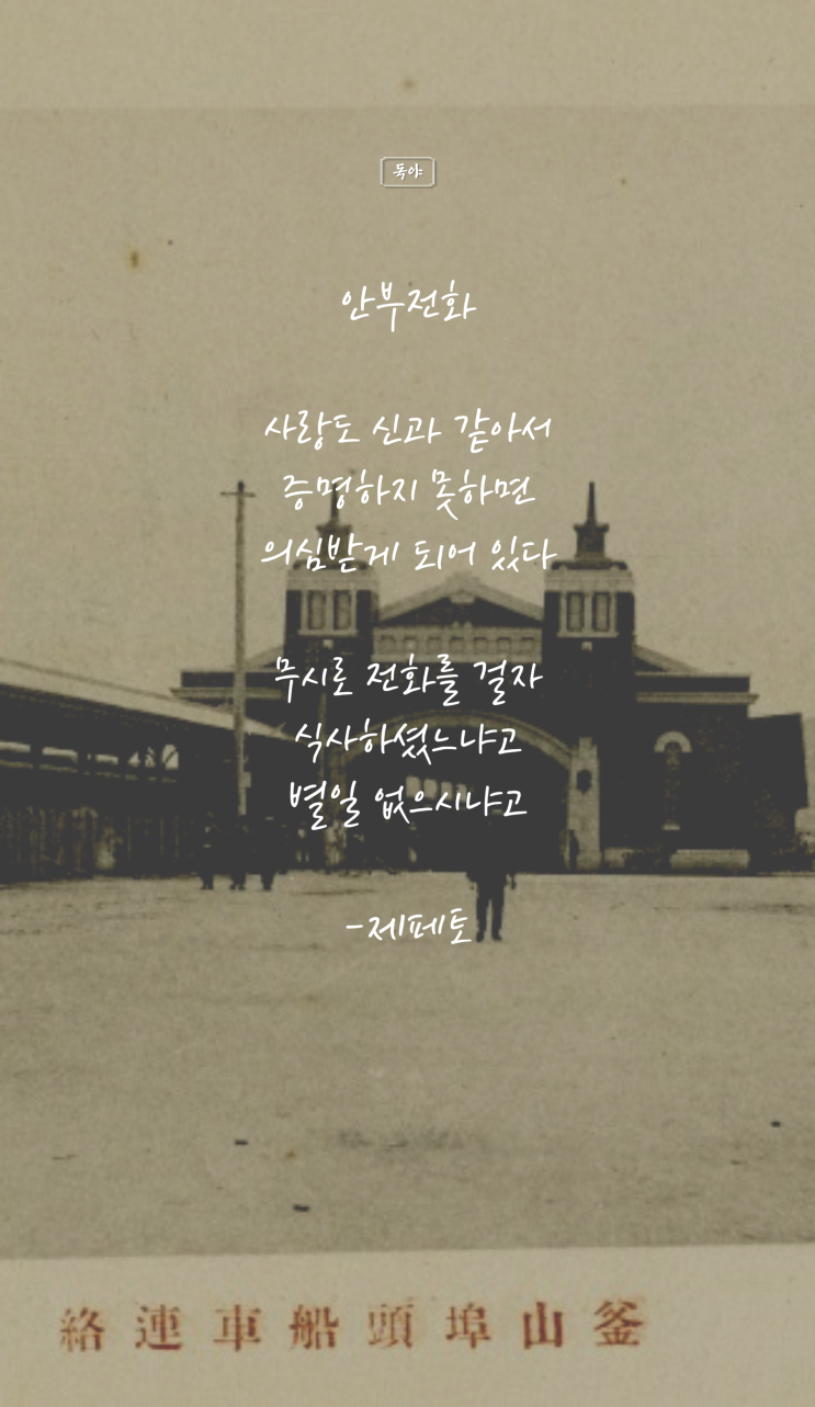 안부전화 사랑도 신과 같아서 증명하지 못하면 의심받게 되어 있다 무시로 전화를 걸자 식사하셨느냐고 별...
