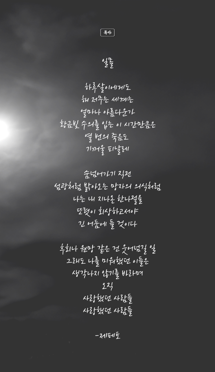 일몰 하루살이에게도 해 저무는 세계는 얼마나 아름다운가 황금빛 수의를 입는 이 시간만큼은 열 번의 죽음...