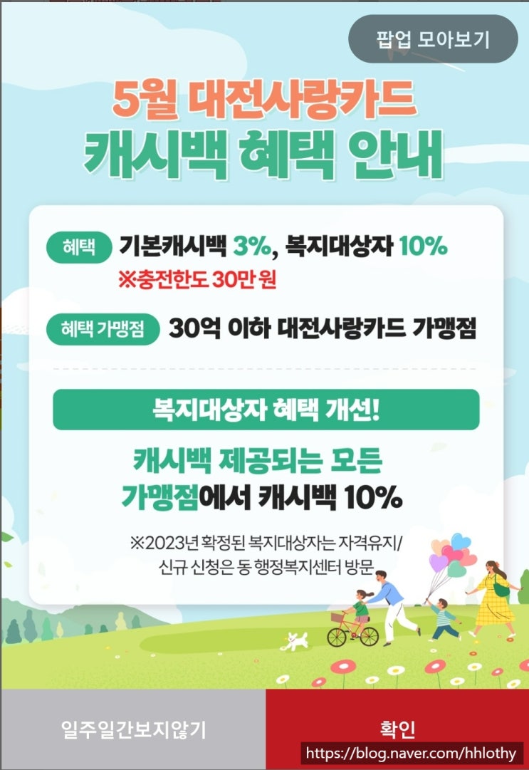 2024년 5월 대전사랑카드 캐시백 혜택 안내 ※ 혜택 : 기본 #캐시백 3%, 복지대상자 10% (충전한도 30만원)...