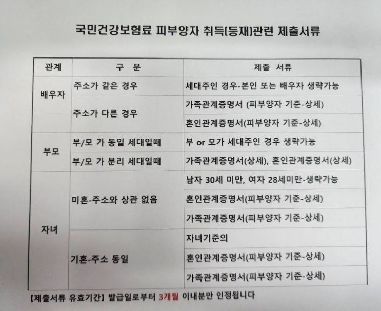 건강보험 피부양자 취득(등재)제출서류