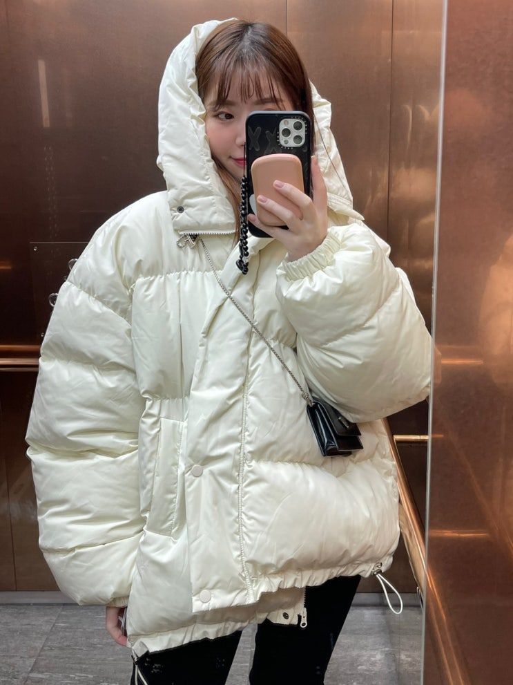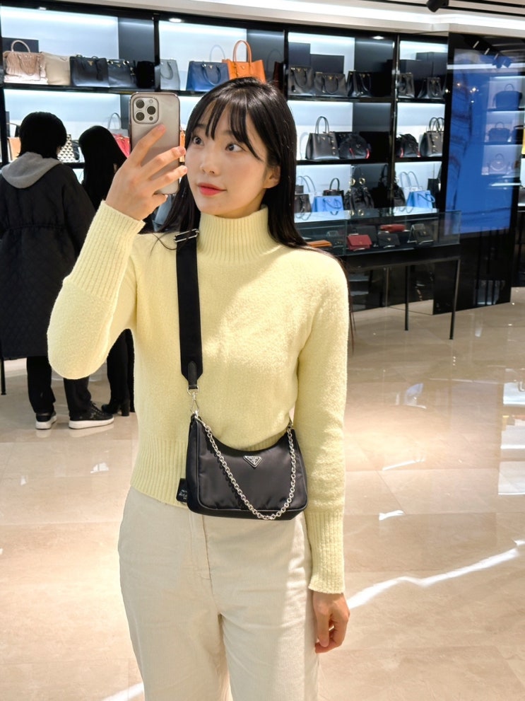프라다 크로스백 한파 패딩 코디 추천 겨울 하객룩 오버핏 숏패딩 신세계백화점 타임스퀘어